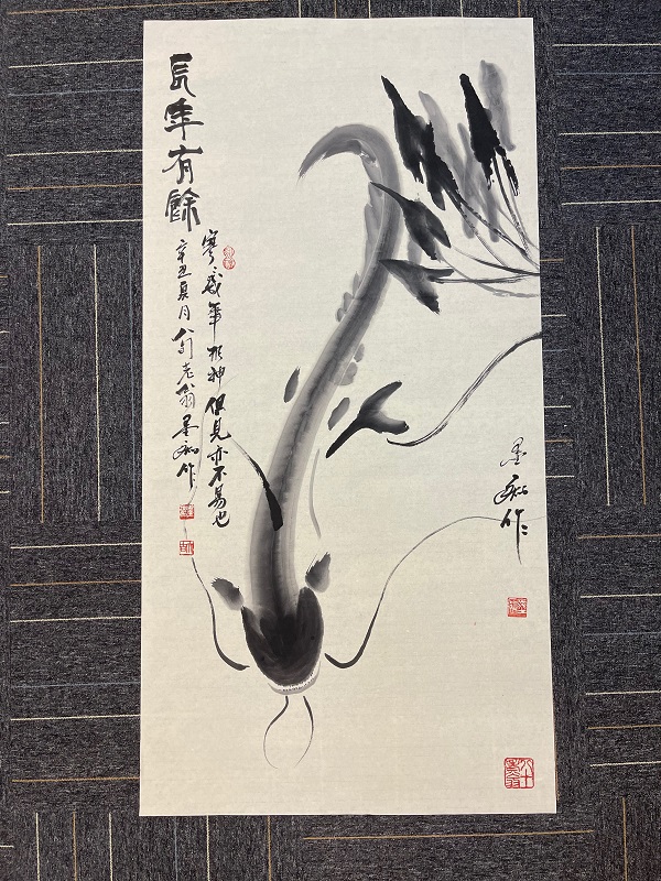 时光荏苒,岁月悠悠。81岁的墨痴大师每天依然广泛地研究古今名作。他画的长鲇,多年数易其法。如此治学之风,当效后人。友人赞其长鲇栩栩如生,他以诗答友:“一世画虾半世鲇,画鲇要比画虾难,若问此中何缘故,只因画鲇更简单。”