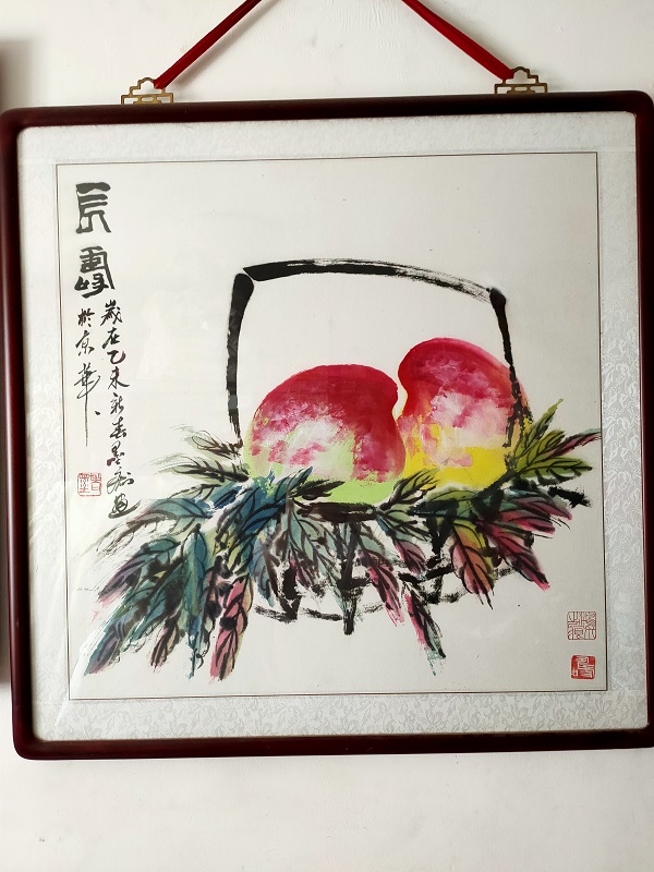 这幅画是墨痴他采用没骨法直接用洋红泼写硕大桃实,渗以少许柠檬黄;再以花青、赭墨写出叶子和枝干,后用浓墨勾勒叶筋,设色浓重艳丽,与其画荷花所创的红花墨叶恰成强烈对照,两个硕桃,寓意善者多寿,布局匠心,疏密有致,又颇具藏露之妙。稍上方的桃子像一对双胞胎对脸坐着,嘴、鼻子、眼睛都可看出来,那两个寿桃上还落上桃叶,这种画法其难度极大,他采用的是中西之法,颇有世宁的事意。
