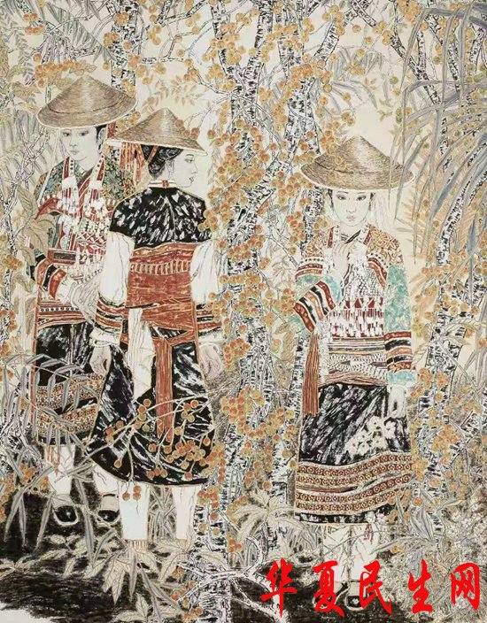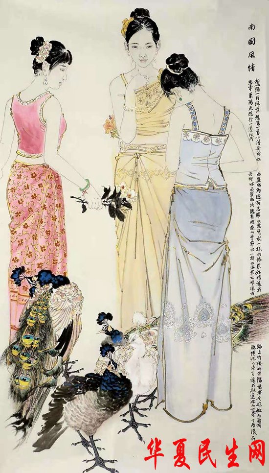 而他的《澜沧江畔取圣水》《梦回天边南腊河》《版纳春晓》等作品更加古典静谧,他曾数次远行西双版纳写生。神奇的热带雨林是他的露天画室,他每天早出晚归一呆数月,吃在傣家,住在傣家,和傣家人一同歌舞,一同下河捕鱼,一同去寺庙赕佛,随时随地的发现、寻觅、体验和升华爱和美的精神意蕴。他时时陶醉于南国那天国般的神奇,钟情那澜沧江的清流,罗梭江的迷离,神往那独木成林的大青树,迷恋那风情万种艳丽如花的傣家小卜哨,那高高的凤尾竹,那烂漫的山花织就的绿肥红瘦的锦霞,那头顶香蕉脚踏菠萝果香四溢的原野,都给了他不尽的创作激情和灵感。