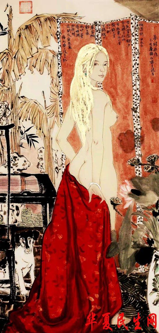 画女人体是不好表现的题材,画不好便易流于“俗”,为避作品的脂粉气、俗气、僵滞和纤弱,恰当地将作品的品格界定在“雅”上,力追唐宋绘画那种雄浑雅健、造型饱满、天然质朴的画风。他尝试用桑皮纸勾形敷色,结合西方素描的方法深入表现,使作品更具艺术感染力。女人是流动的艺术,古往今来人体之美,是人类刻画、探索的一项重要学科。罗丹曾经说过:“美就是性格的表现,自然界中没有任何东西比人体更有性格,人体由于它的力和美,可以唤起种种不同的意象”。刘海粟先生也曾说:“人体美是美中至美,女人体以阴柔之美,柔软、弹性和宁静感,像柔柔的常青藤缠绕在艺术家的智慧之中,陶醉着他们的情思,撞击着灵感的闸门,使之创造出有血有肉、有情有义的生命来”。