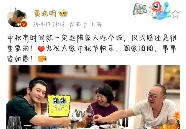 话说回来,其实9月17日,黄晓明晒出和家人一起过中秋的合影。合影中,黄晓明的父母眼里只有小海绵,只有黄晓明一个人看着镜头,网友猜测拍摄照片的正是叶珂。