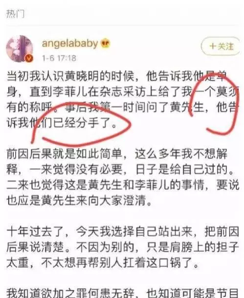 直接在个人微博平台上发文解释自己并不是小三,声称当初认识黄晓明时他告诉自己他是单身,这么多年来不解释是觉得没必要,今天站出来是因为“不太想再帮别人扛着这口锅了”。