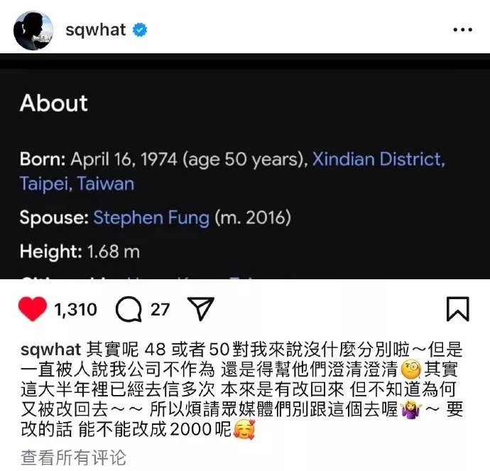 搜狐娱乐讯 20日,舒淇在社交媒体平台上发文回应年龄争议。她说:“其实呢,48或者50对我来说没什么分别啦~但是一直被人说我公司不作为,还是得帮他们澄清澄清,其实这大半年里已经去信多次,本来是有改回来,但不知道为何又被改回去~所以烦请众媒体们别跟这个去喔~要改的话能不能改成2000呢?”