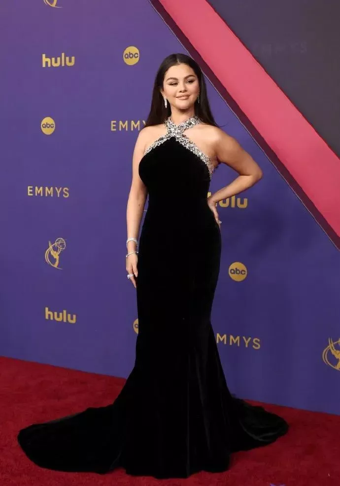 而这一届的艾美奖,赛琳娜是以颁奖嘉宾的身份出席的,当天她身穿一条黑丝绒绕脖吊带鱼尾服走上了红毯,礼服的衣领由方形亮片拼接而成,搭配她的钻石耳坠和钻石手链、戒指,整个人都blingbling的。