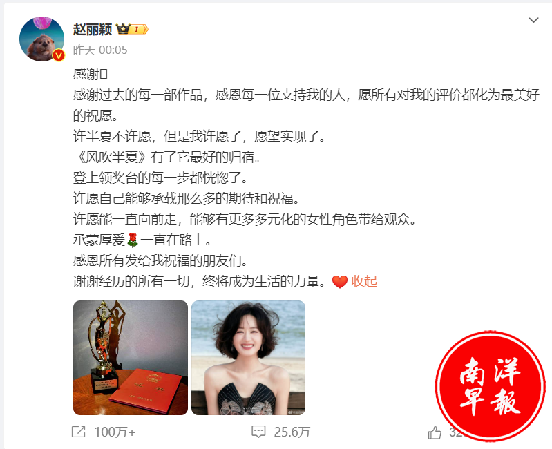 赵丽颖得奖了,而且还是“飞天奖”。