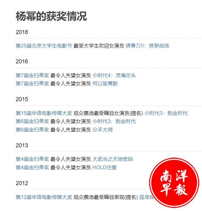 回看杨幂影视类得到过的奖,说实话都有点“水”。豆瓣词条上,给杨幂收录最多的奖项,竟然是金扫帚最令人失望女演员奖。