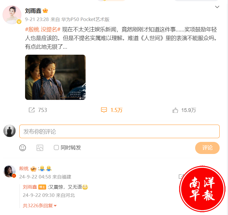 演员刘雨鑫发微博直接声援殷桃,获得了近16万的点赞和殷桃留言,随即登上了微博热搜。