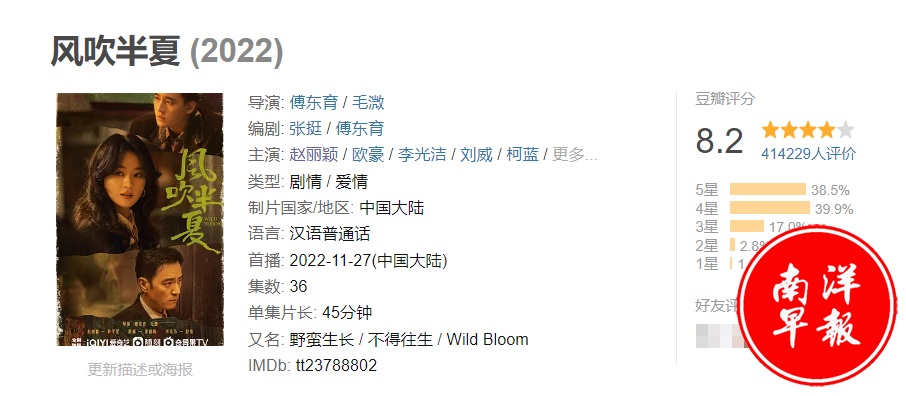 《风吹半夏》目前在豆瓣上是8.2分,曾经获得过第28届上海电视节白玉兰奖最佳中国电视剧的提名。如今,该剧又多了两项殊荣:“飞天奖”优秀女演员和优秀电视剧。