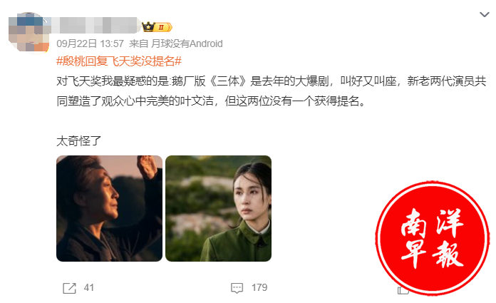 除了替殷桃打抱不平,也有人为《三体》的老和青两版的叶文洁扮演者陈瑾和王子文发声,觉得两人总该有一位可以得到提名。