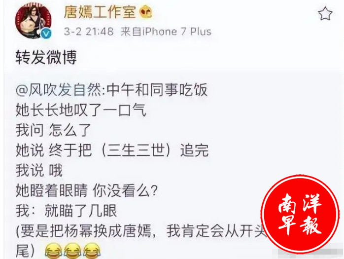 结果,杨幂《三生》播出的时候,唐嫣工作室居然发文内涵。