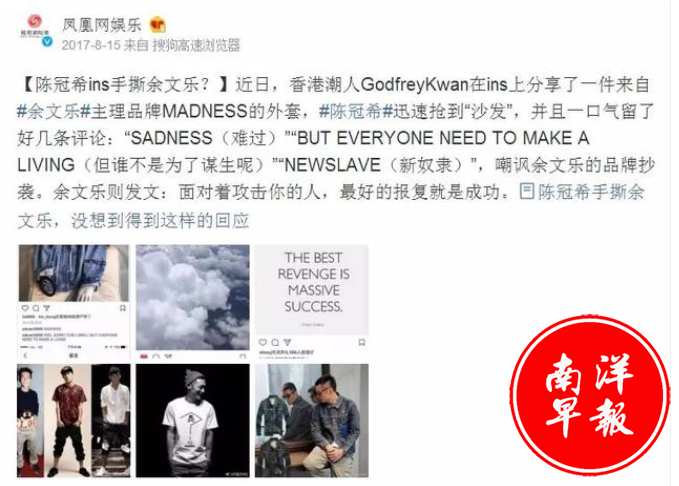 陈冠希看不惯余文乐的风格,直接发文嘲笑余文乐抄袭,余文乐则表示,相对攻击,最好的报复就是成功。