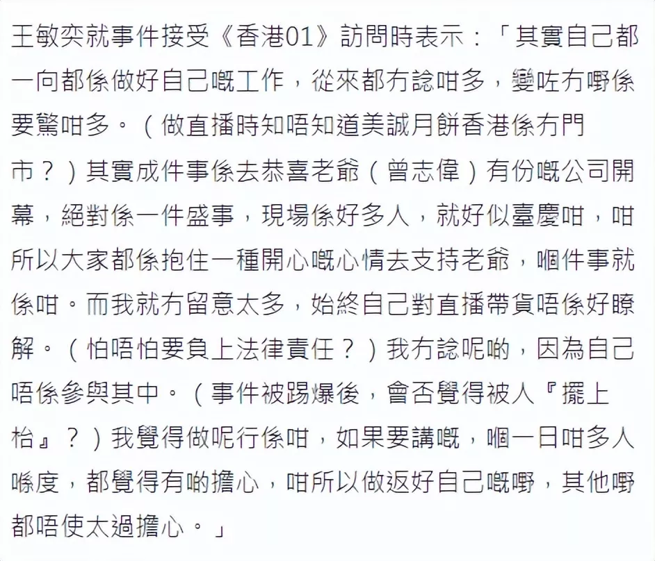 王敏奕回应,一向只做自己的工作,从来没想那么多和后怕什么,起初是想去恭喜公公(曾志伟)有份参与的公司开幕,现场有很多人像台庆一样,抱着一种开心的心情去支持,当时没有考虑太多,始终对带货直播不是很了解。