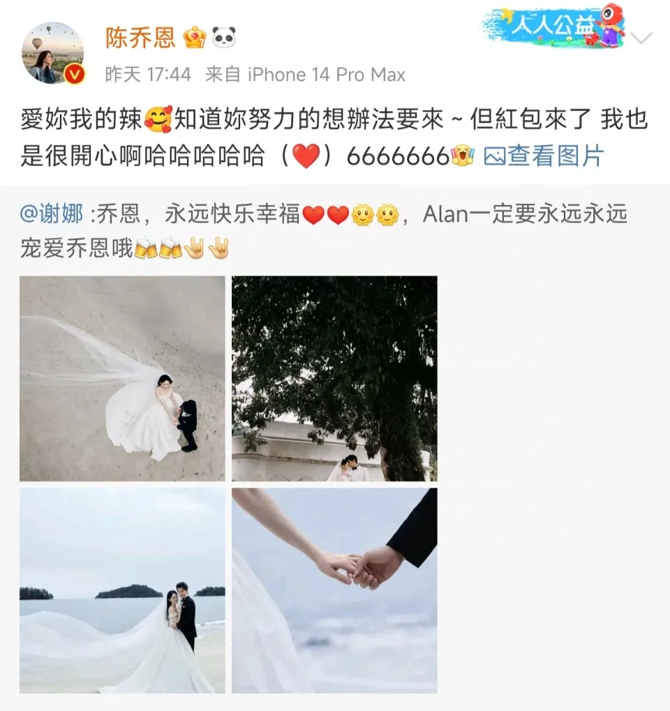 之后陈乔恩回复并转发了谢娜的发文,称因为工作原因谢娜才无法来到婚礼现场,但看到好友的祝福依旧很开心,并晒出了谢娜的转账记录66666.66元。