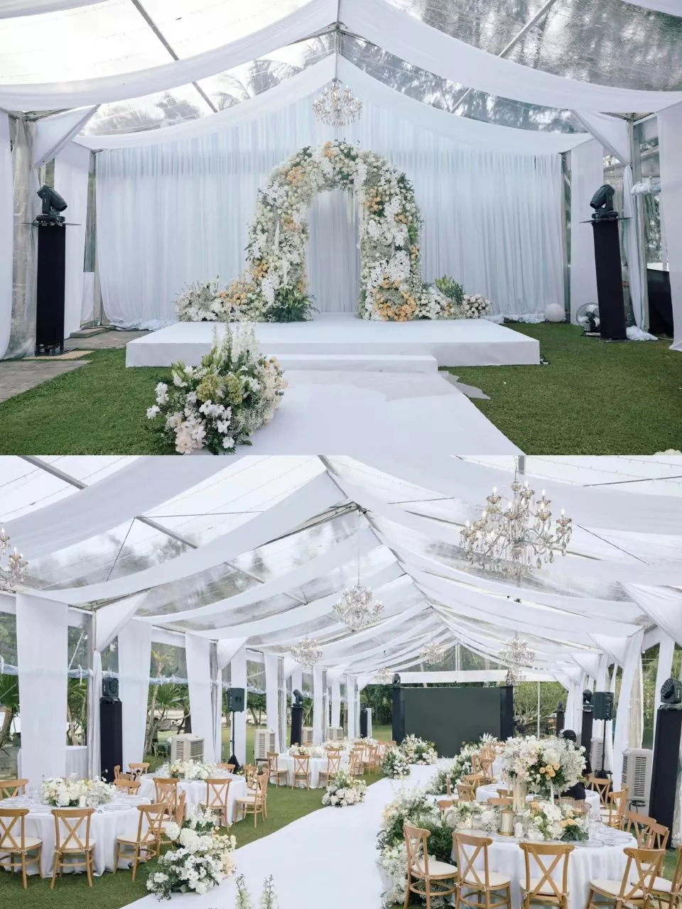 尽管是时隔两年才举行婚礼,但陈乔恩与Alan的婚礼就如同两人的感情一样低调却又不失浪漫,婚礼举行地特意选在了两人的定情地马来西亚兰卡威,婚礼现场布置简单但氛围感十足,婚礼现场主打白色,白色的玫瑰花和纱幔纯洁又浪漫,整体布景温馨雅致、自然清新。