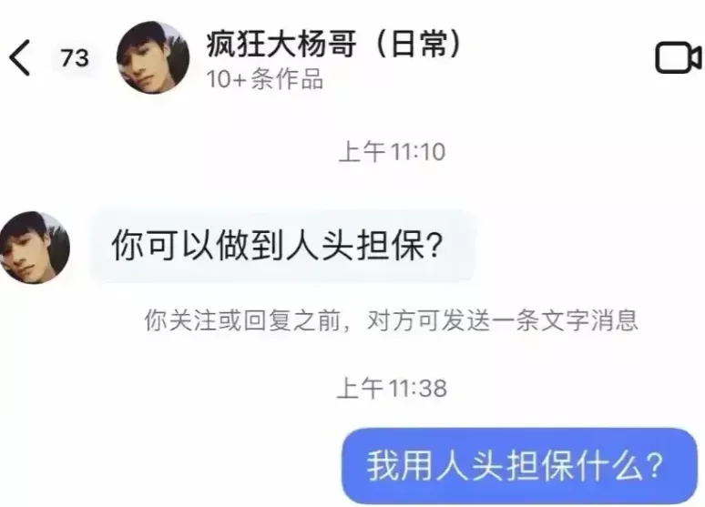 有网友晒出最新与大杨哥的聊天记录,大杨哥问网友“能不能用人头担保”,网友一头雾水。三只羊还有其他的瓜是肯定的,只是现在谁也不知道下一个瓜会砸在谁的头上。