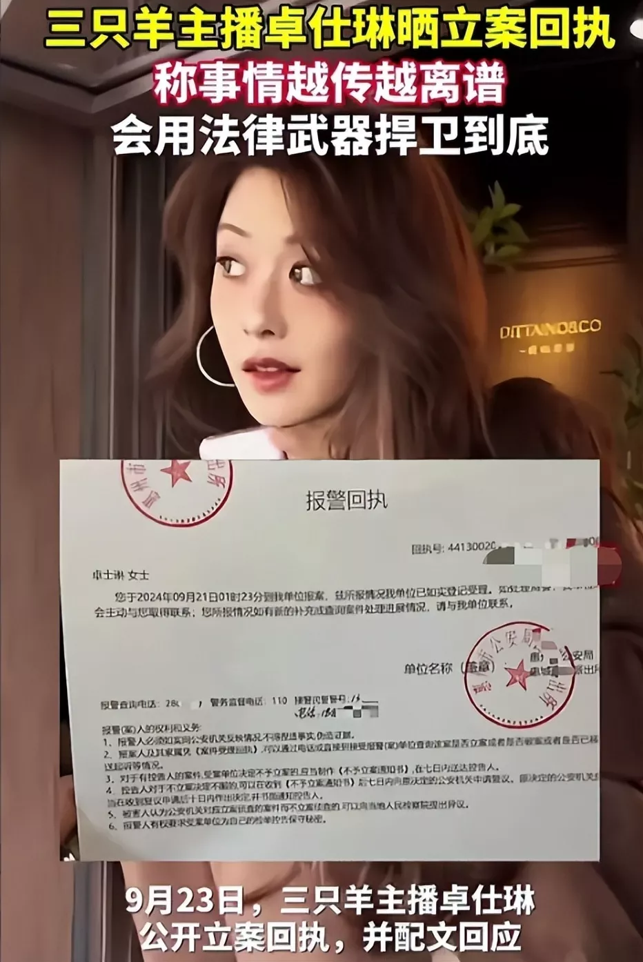 9月23日,卓仕琳刻不容缓,晒出立案回执,随后更发出长文,表示自己从小家境就很好,做主播纯粹只想好好工作证明自己的能力,结果被有心人利用,录音可能是真的,但如今事情越传越离谱,她只能用法律武器捍卫自己的名誉。