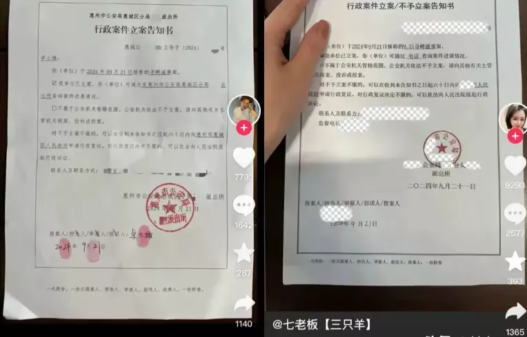 网友立即将卓仕琳与七老板的立案回执对比起来,大大方方与遮遮掩掩确实有很大区别。