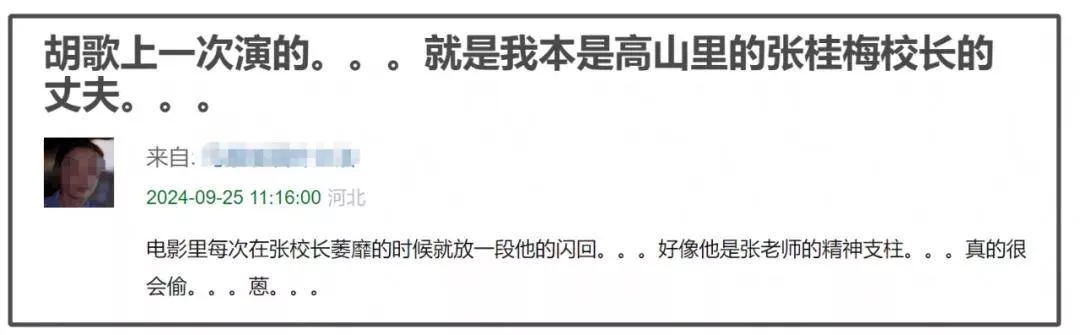 在以张桂梅校长为原型改编的影片《我本是高山》中,胡歌饰演了张桂梅丈夫的角色。电影中只要张校长因遇到挫折和坎坷而萎靡不振,就会闪回和他有关的片段,他成了张校长的精神支柱,让观众直呼“魔改”,将本来心存大义的张校长衬托成了爱情至上的人。