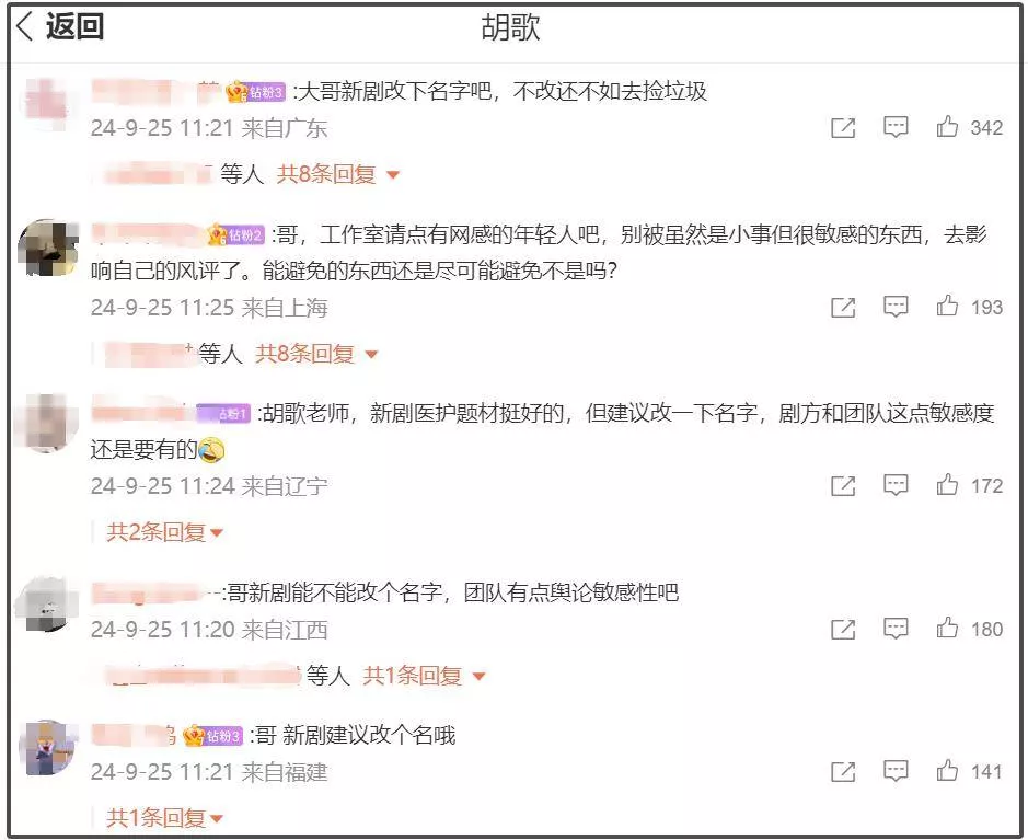 包括胡歌本人的微博也沦陷,粉丝都在呼吁修改剧名,看上去大家还算心平气和,都认为是团队大意。