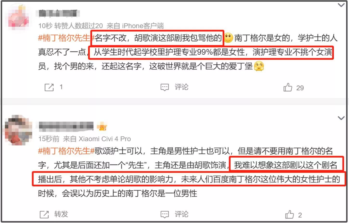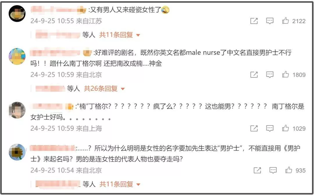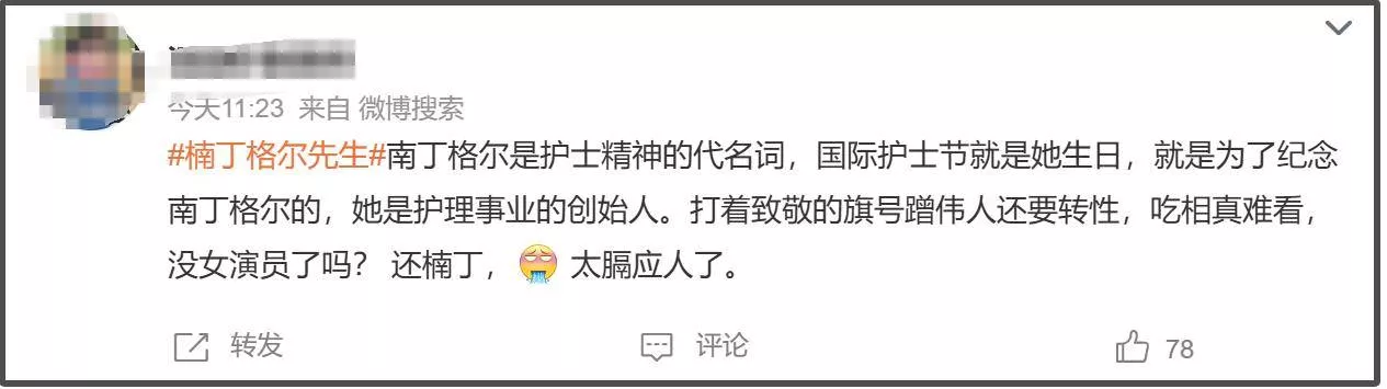 一部英文名为《MALE NURSE》(译为男护士)的大男主题材作品,中文名直接取了身为护士教育创始人的女性名人的谐音,只是欲盖弥彰的将“南”改为“楠”,这种种行为立刻引发大众的不满,官宣博的评论区瞬间沦陷。这样用女性名人给男角色镀金的举动堪比碰瓷,蹭女性代表人物热度给男性角色高光的行为更是让大家愤愤不平,甚至已经开始有人抵制。