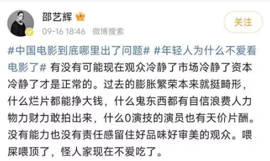 她们,会犀利点评业界遇到的问题。最近几个月,暑期档和中秋档内地票房持续低迷,关于“中国电影哪里出了问题”的话题被顶上热搜。《爱情神话》导演邵艺辉,在微博犀利发声,“有没有可能现在观众冷静了,市场冷静了,资本冷静了,才是正常的。”