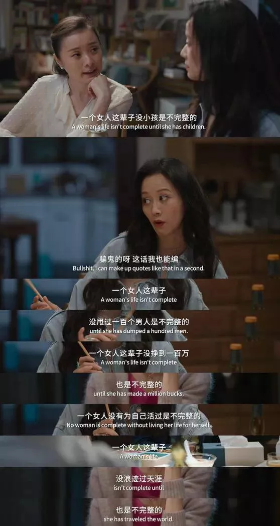 女人们一句跟着一句轮番“造反”,反击社会强加在女人身上的性别标签和道德包袱,好不痛快。
