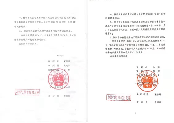 德卡公司负责人向记者介绍说:该公司2006年全额垫资建一所县医院,政府失信欠德卡公司工程款不还。德卡公司将扶余市政府起诉至法院后,松原中院依据合同事实,判决县医院按合同约定工程交付后每年支付德卡公司200万元工程款,2015年给付完毕,利息约定按农村信用社贷款利率计算,本金5404298元(利息从2016年1月1日起按照吉林省农村信用社贷款利率给付)。县医院上诉到了省高院后,刘阳法官却罔顾事实,不按合同约定裁判,竟把由扶余县(后改名扶余市)政府、财政局、卫生局承诺担保工程款的合同否掉。在刘阳法官的眼里,双方签订的有效合同是没有用的,合同条款明确约定付款方式及利息的计算按农村信用社利率计算利息,刘阳法官却判决本金还没到期、利息按照人民银行的基准利率计算利息。企业认为该判决严重违背历史和事实,是对企业极不公平的判决,纯属枉法裁判。对于刘阳法官的枉法裁判,德卡公司曾经多次实名举报到省高院和吉林省高级法院监察室,但是至今没有任何结果,也没有收到回复。
