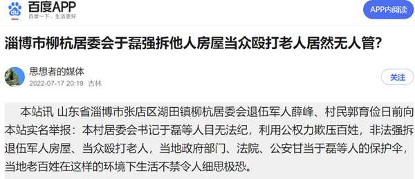淄博市柳杭居委会于磊强拆他人房屋当众殴打老人居然无人管?