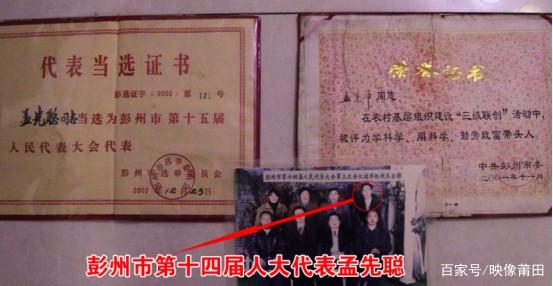 孟先聪当选市14届人大代表的合影、15届人大代表的证书、被评为科技带头人的证书