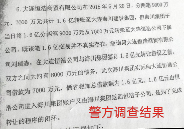 这个结果,拚命几年讨债的市民不干了,他们想到了报告警方来立案调查此事,因恶意避债是件违法的事。可警方调查一圈后,结果同样令讨债的市民吃惊,因这价值1.6亿的财产,就在“大连海川”转给“大连恒浩”的当天,“大连海川”又将1.6亿原封不动地转回了“大连恒浩”的另一家实控公司,这已充分说明,成立这家“大连恒浩”只是一个为了转移资产的“托”。