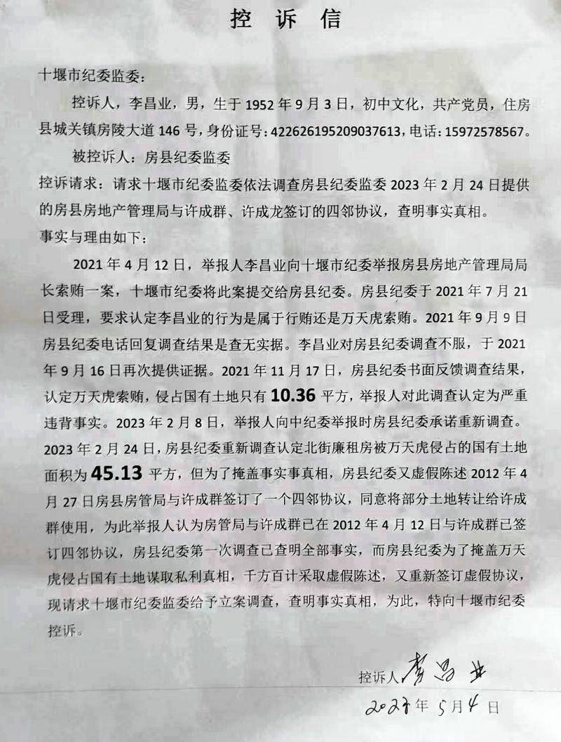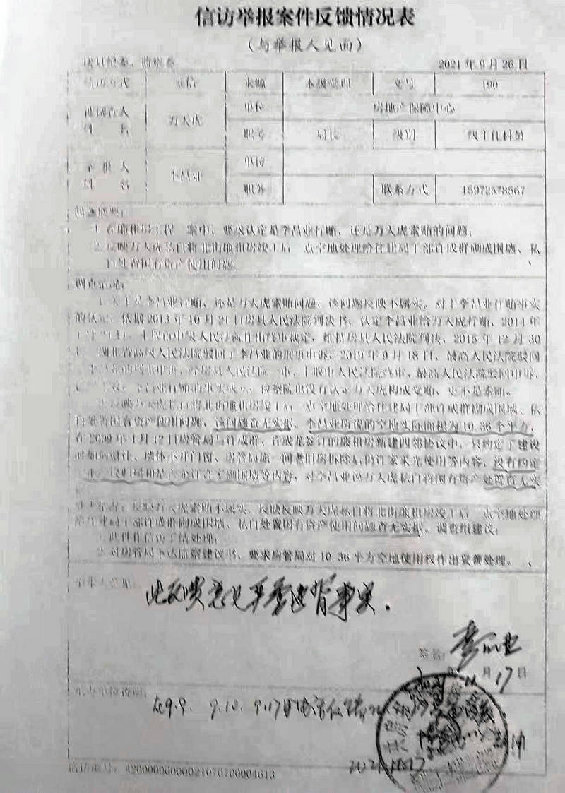 2021年11月17日,根据李昌业的请求,房县纪委给予书面反馈:对关于文件丢失的原因,房县纪委以种种借口拒不调查,掩盖事实真相。而关于万天虎将国有土地私自交易问题,经查只有10.36平米。李昌业对该调查反馈意见极为不满,认为调查结果严重违背事实,请求房县纪委重新立案调查,在此后时间内向十堰市纪委、湖北省纪委递交材料,得到回复均是该案发生在房县,根据纪委有关规定必须由房县纪委调查处理。而房县纪委的回复是在2021年11月17日房县纪委已做出了回复,这就是房县纪委的最后结论。