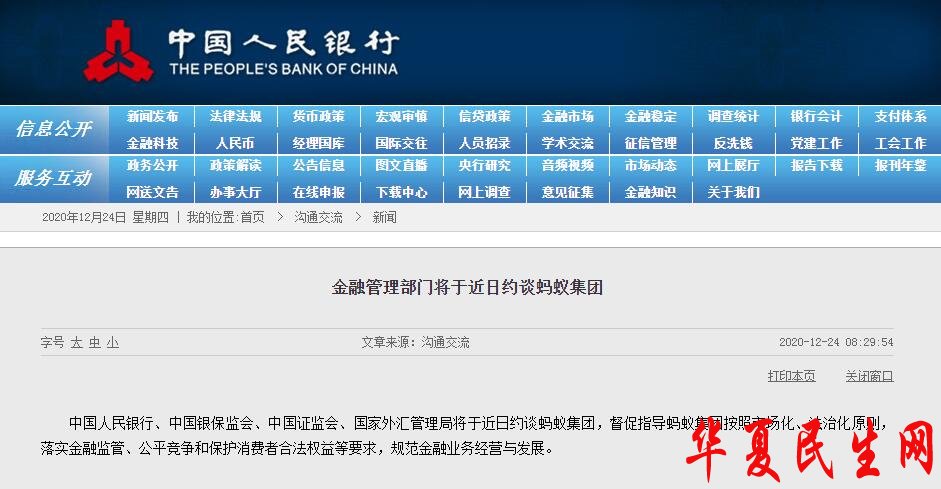 中国网12月24日讯 据中国人民银行网站今日消息,中国人民银行、中国银保监会、中国证监会、国家外汇管理局将于近日约谈蚂蚁集团,督促指导蚂蚁集团按照市场化、法治化原则,落实金融监管、公平竞争和保护消费者合法权益等要求,规范金融业务经营与发展。