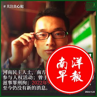 据悉,贾榀在中共二十大前去往广西北海市,随后向友人传信说被河南国保带回,从2022924日至今再无消息。至今已经超过两年,目前处于强迫失踪的状态。