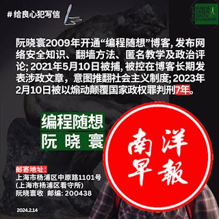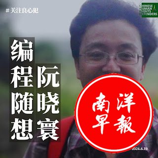 阮晓寰:网名“编程随想”。1977年6月10日出生,福建省泉州市人,上海市杨浦区民京路558号长住居民,网络安全工程师,民主异见人士,中国在押政治犯。