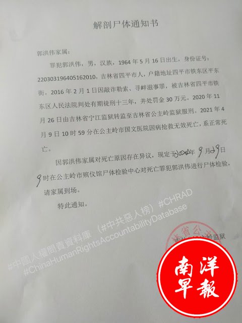 郭洪伟在公主岭监狱服刑期间于2021年4月9日被宣告死亡。郭洪伟亲属持疑,一直在追查真相、未得!......我们亲属完全有理由相信郭洪伟是非正常死亡!事实理由如下: