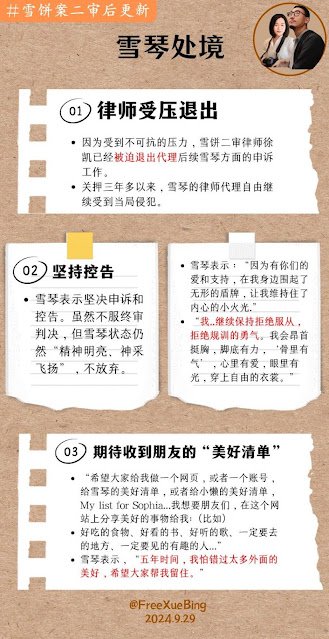① 二审律师受压退出:因为受到不可抗压力,黄雪琴二审代理律师徐凯已经被迫退出代理后续雪琴方面的申诉工作。关押3年了,黄雪琴自定代理律师的自由继续受到当局的侵犯。
