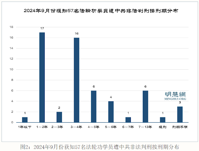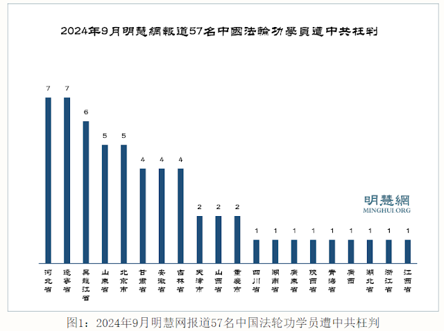 (维权网信息中心报道)2024年10月7日,本网获悉:据明慧网报道统计,二零二四年九月份又获知18名中国大陆法轮功学员遭迫害离世或含冤离世;至少有57名中国大陆法轮功学员遭中共非法判刑,平均年龄63岁(不包括年龄未知者),非法判刑最严重地区依次为:河北省、辽宁省均7人,黑龙江省6人、山东省、北京市均5人。非法刑期最高达十三年。