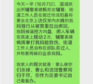 今天一早(10月7日),滨湖派出所辅警姜建枫和女辅警、街道工作人员在宿迁市沭阳县将要去北京上访仅穿内衣裤的我妈强行从被窝里拉出绑回,我妈被逼抢方向盘,绑人车辆在高速上摆动2次,辅警姜建枫挥拳打我妈脸致伤,街道工作人员自称在部队杀过人,并称要再操旧业枪杀我妈。