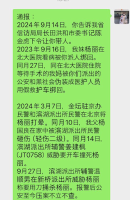 2024年3月7日,杨丽被逼向习近平求助,在北京被金坛驻京办民警和滨湖派出所民警打晕。同月10日,我父杨国良在家中被滨湖派出所民警砸伤(轻伤二级)。同月14日,滨湖派出所辅警姜建枫(JT0758)威胁要开车撞死杨丽。