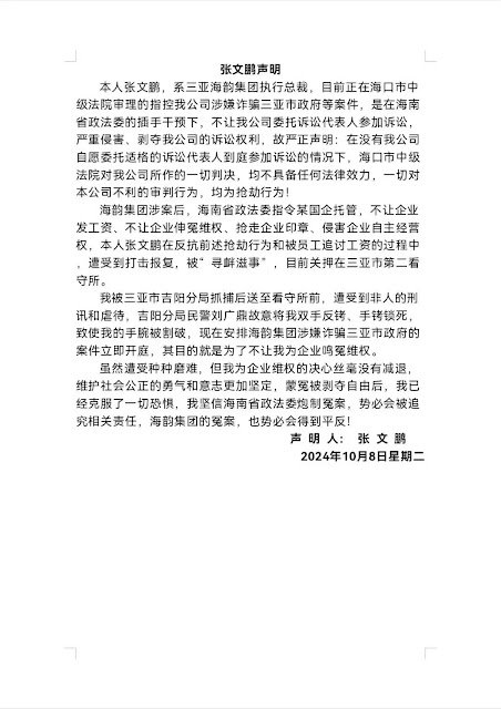 2024年9月24日,张文鹏又因为代理海韵集团案件,帮助当事人喊冤,被三亚警方以涉嫌寻衅滋事罪予以刑事拘留。就在他被刑事拘留前,该案辩护人北大博士张庆方律师被通知将吊销律师执照。这显然就是三亚警方利用公权对海韵代理人予以打击报复。