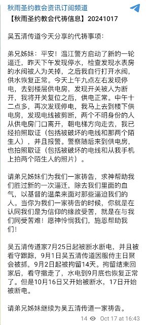 (维权网信息中心报道)2024年10月18日,本网获悉:日前,秋雨圣约教会吴五清传道家中又被断水断电。