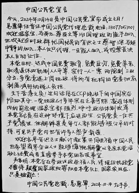 易惠军在其撰写的《中国公民党宣言》中写到:“2024年10月14日是中国公民党宣布成立之日!