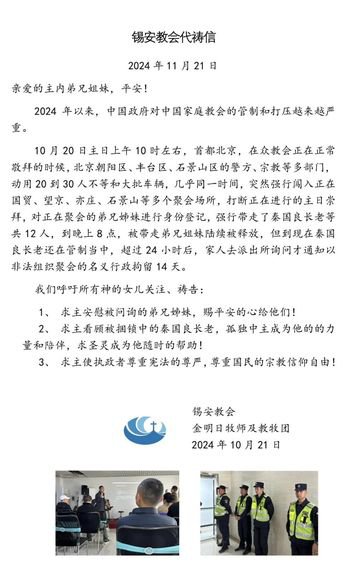 (维权网信息中心报道)2024年10月23日,本网获悉:2024年10月20日星期日上午10时左右,北京锡安教会多个堂点同时受冲击。北京朝阳区、丰台区、石景山区的警方、宗教等多部门,动用20到30人不等和大批车辆,几乎同一时间,突然强行闯入正在国贸、望京、亦庄、石景山等多个聚会场所,打断正在进行的主日崇拜,对正在聚会的基督徒进行身份登记,强行带走了秦国良长老等共12人。