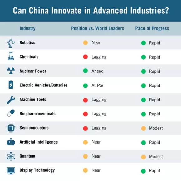 报告显示,中国在核能方面领先;在电动汽车与电池方面与全球水平持平;在机器人、显示技术、人工智能和量子计算领域接近领先;但在化工、机床、半导体和生物技术方面则相对落后。除了半导体领域因出口管制而进展受阻,中国在其他领域的进展速度“惊人”。报告警告说,如果不采取措施应对中国政府主导的创新浪潮,美国及其盟友将很快将被迫追赶中国。