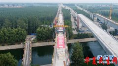 在天津市宝坻区中铁一局京滨铁路一标项目工地,京滨铁路宝坻特大桥跨引滦入津输水明渠连续梁即将合龙(9月13日摄,无人机照片)。 新华社发(孙凡越 摄) 新华社天津12月23日电...